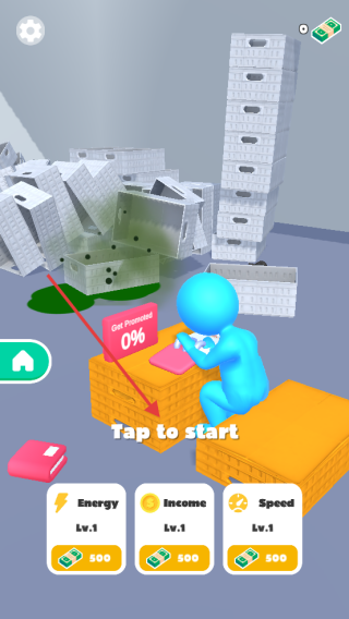 1、进入作品后,点击屏幕下方的“Taptostart”按钮,操控蓝色小人开始工作。