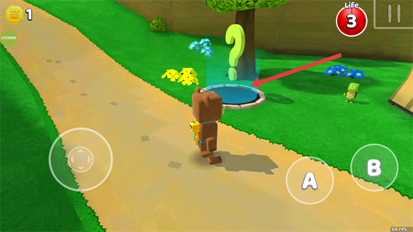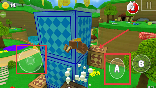 4、通过左侧方向键调整方向,按【A】键跳跃d到前方箱子,收集金币,注意生命值变化。