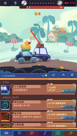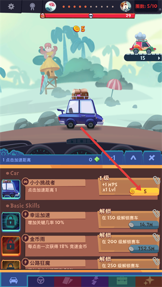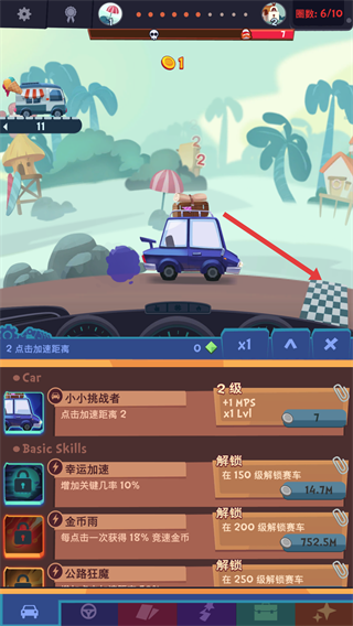 2、在汽车升级界面,点击消耗金币的升级按钮,提升【点击加速距离】等级,增强赛车加速能力,助力比赛。