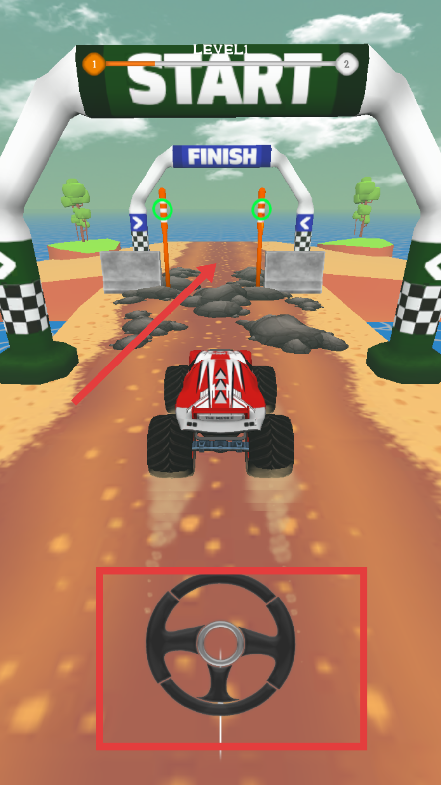 2、通过下方方向盘操控赛车,沿赛道避开岩石障碍,朝着【FINISH】终点方向行驶。