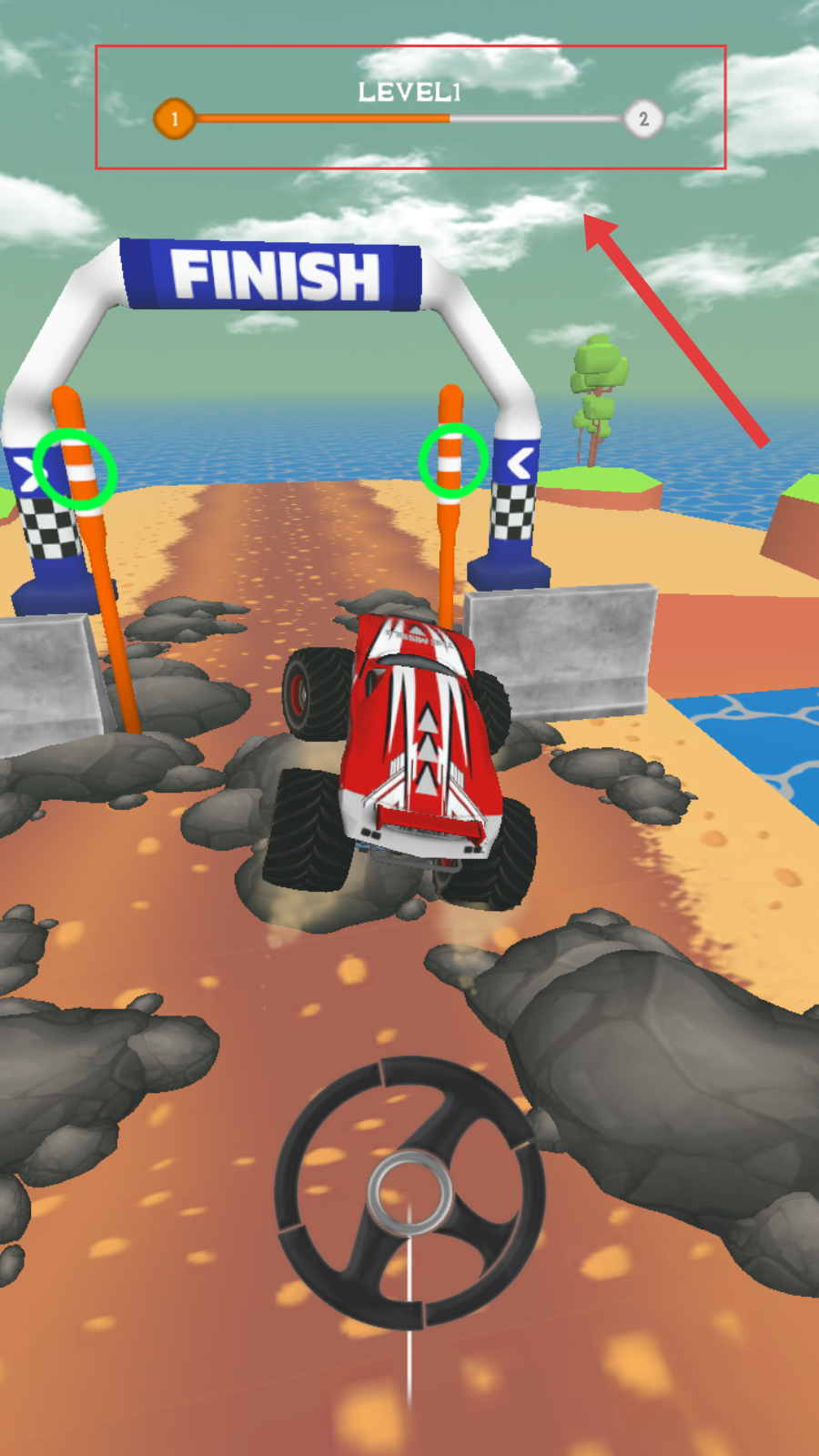 3、关注上方【LEVEL-1】进度条,操控赛车在崎岖石路行驶,通过障碍推进关卡进度。