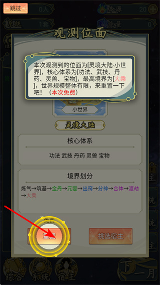 2、在寻找宿主界面中,点击观测位面按钮,这是探索不同位面的核心操作,每隔数月可免费观测,利用该机会寻找优质宿主。