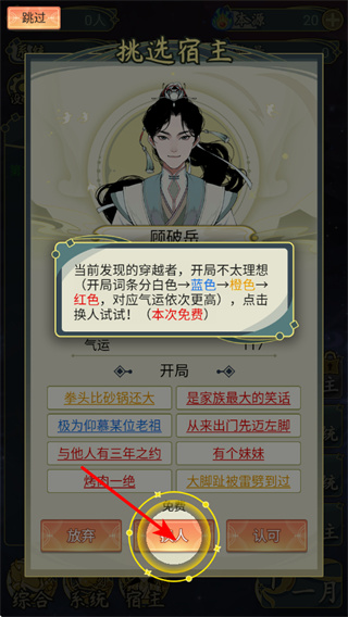 4、挑选宿主时,点击换人按钮,这是更换穿越者的基础操作,若当前宿主气运或开局词条不理想,可免费换人以获得更优质的宿主。