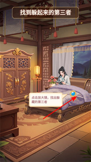 2、在找到躲起来的第三者任务中,点击放大镜按钮,这是触发寻找功能的核心操作,使用后可放大场景细节。
