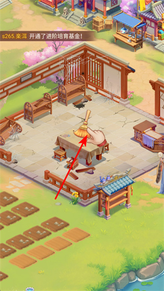 4、在场景互动环节,根据指引点击扫帚等互动道具,这是场景探索的基础操作,互动后可解锁新区域或获取资源。