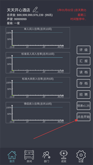 1、点击点击开始,推进游戏时间,开始酒店经营。