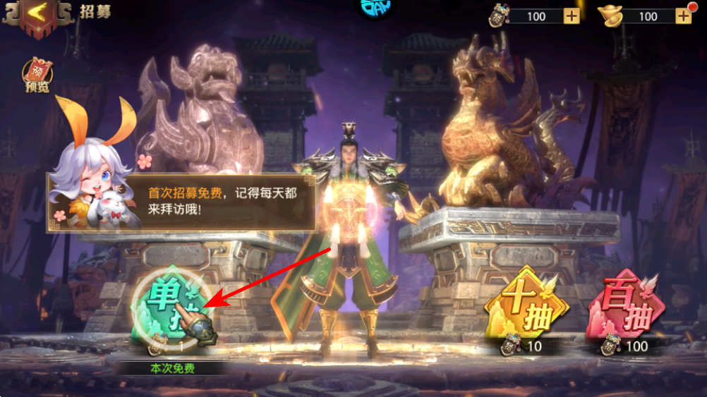 2、进入精英招募界面后,点击按钮,这是启动单次招募的核心操作,首次招募免费,后续可消耗对应资源抽取武将。