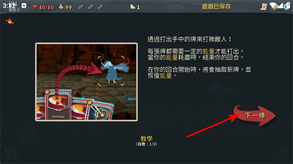 3、战斗教学环节,点击下一条按钮,这是推进教学流程的关键步骤,需依次查看教学内容,掌握出牌、能量管理等战斗基础规则。