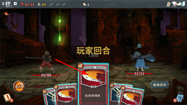4、进入战斗回合后,点击手中的攻击卡牌如打击,这是发起攻击的基础操作,需根据卡牌能量消耗与伤害效果,出牌时机以击败敌人。