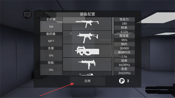 2、在装备配置界面,选择主武器如M4、副武器如MP7等,点击应用装备武器。