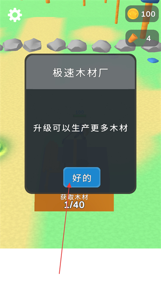 4、持续砍树、积累木材、升级建筑,完成木材获取目标如1/40,逐步推进游戏进程,实现通关。