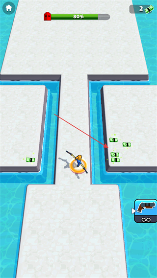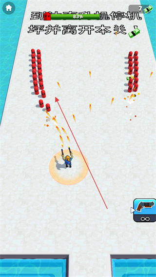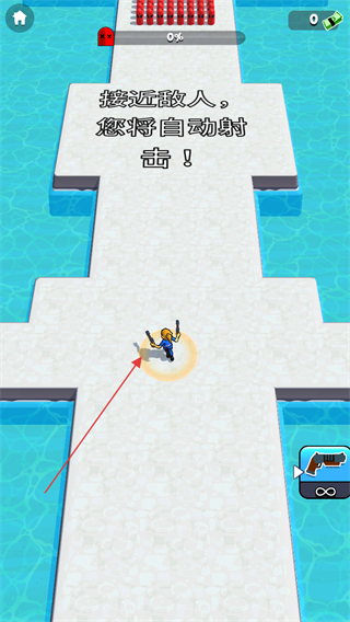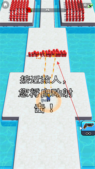 1、操控角色在赛道上移动,接近敌人时会自动射击,消灭红色敌人集群。