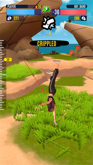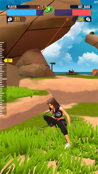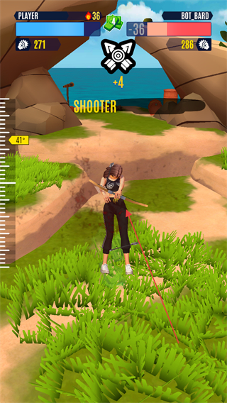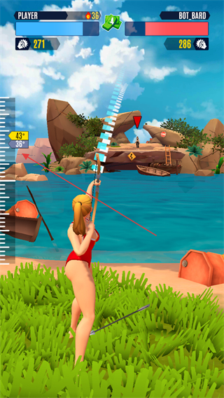 2、根据场景地形如沙滩、岩石区、水域和敌我距离,精准调整角度,确保箭的轨迹能命中敌方。