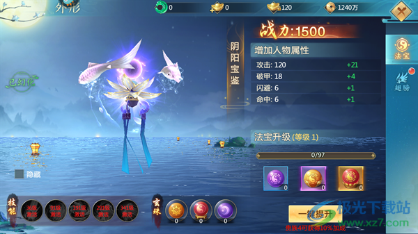 2、法宝,法宝是玩家变强的重要道具,其本身高额的额外属性赋予玩家更强大的战斗力,法宝自带的强大技能也给予玩家助力。