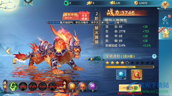 1.提升坐骑等级可以提升海量综合属性,激活坐骑外形还可以获得按百分比回复生命值的特殊技能,并获得专有的外形显示。