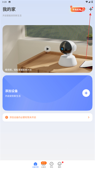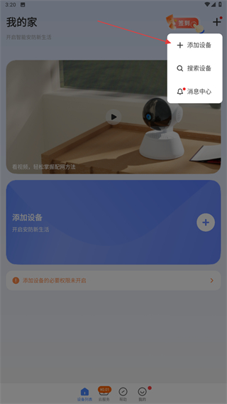 1、打开v380的应用软件,进入首页点击右上方+的图标。
