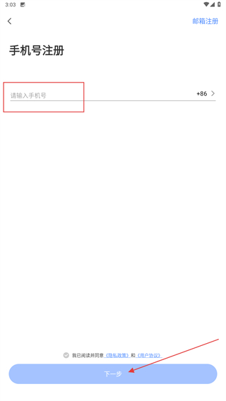 2、进入手机号注册的页面内,输入手机号再点击下一步。