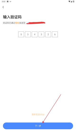 3、将收到的验证码输入其中后,再点击下一步的按钮。