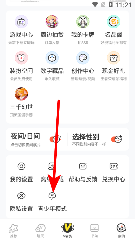 2、在个人界面,点击青少年模式选项,进入青少年守护模式页面。