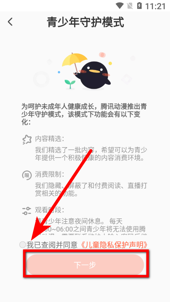 3、在青少年守护模式页面,勾选我已查阅并同意后点击下一步。