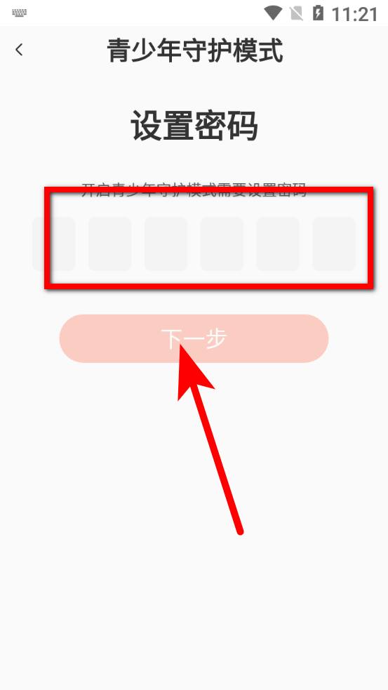 4、在设置密码页面,设置密码后点击下一步,即可开启青少年模式。