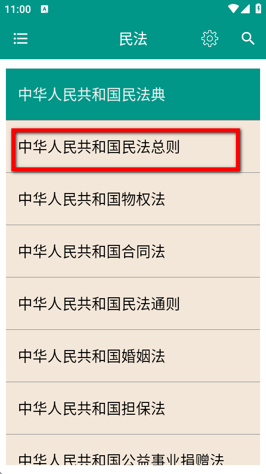 3、在民法分类页面,点击中华人民共和国民法总则等具体法律条目。