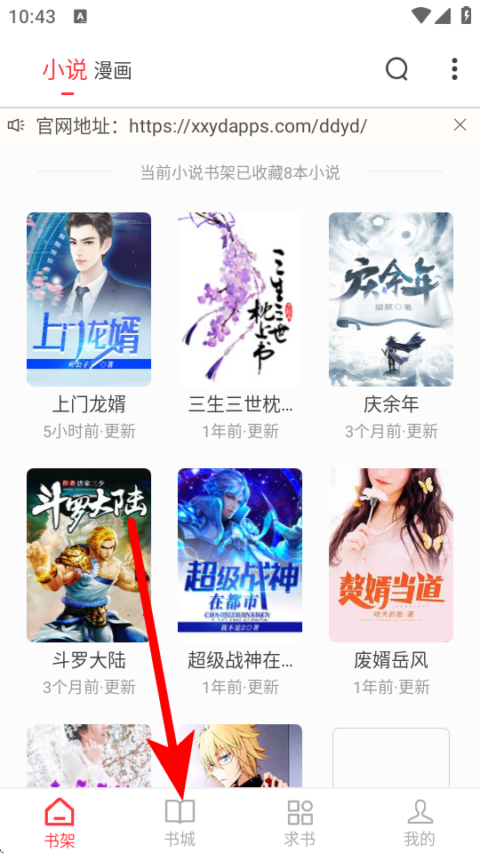 1、在点点阅读书架页面,点击书城选项,进入书城界面。