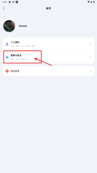 3、在账号页面,点击登录与安全选项,进入登录与安全页面。