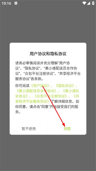 1、打开裹小递配送员,在弹出的窗口中,点击同意按钮。
