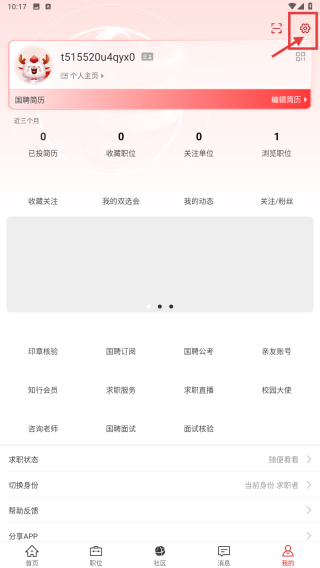 1、打开求职类应用,点击底部我的选项,进入个人中心页面。