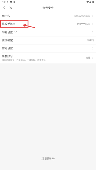 4、在账号安全页面,点击修改手机号选项,进入手机号修改页面完成手机号修改操作。