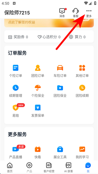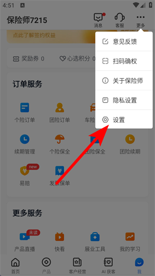 1、打开保险师APP我的页面,点击右上角更多,展开功能的菜单。