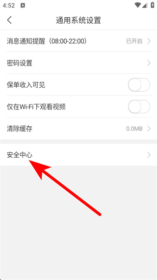 4、在通用系统设置页面,点击安全中心,进入安全中心页面。