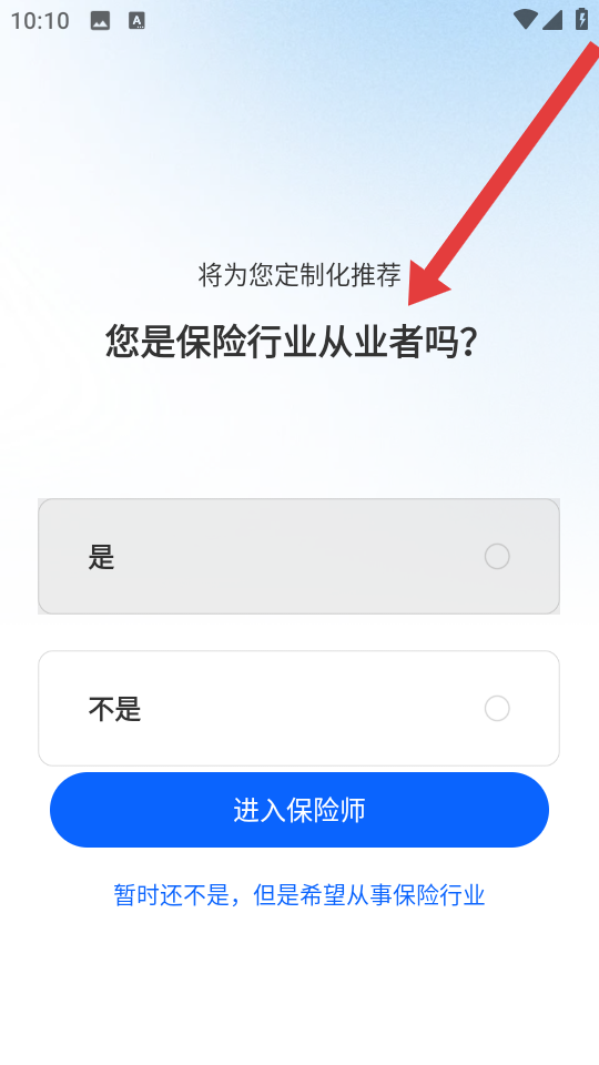 1、在身份选择页,按需选择是或不是保险行业的从业者,点击进入保险师,开启定制化服务。