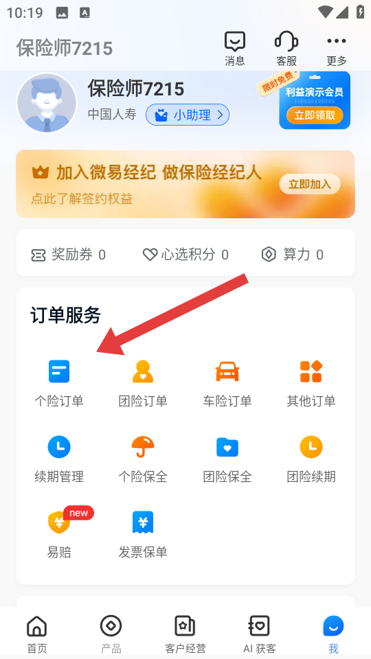 2、进入我的账号页面,在订单服务的板块中,我们需要点击个险订单,来查看个人险订单详情。