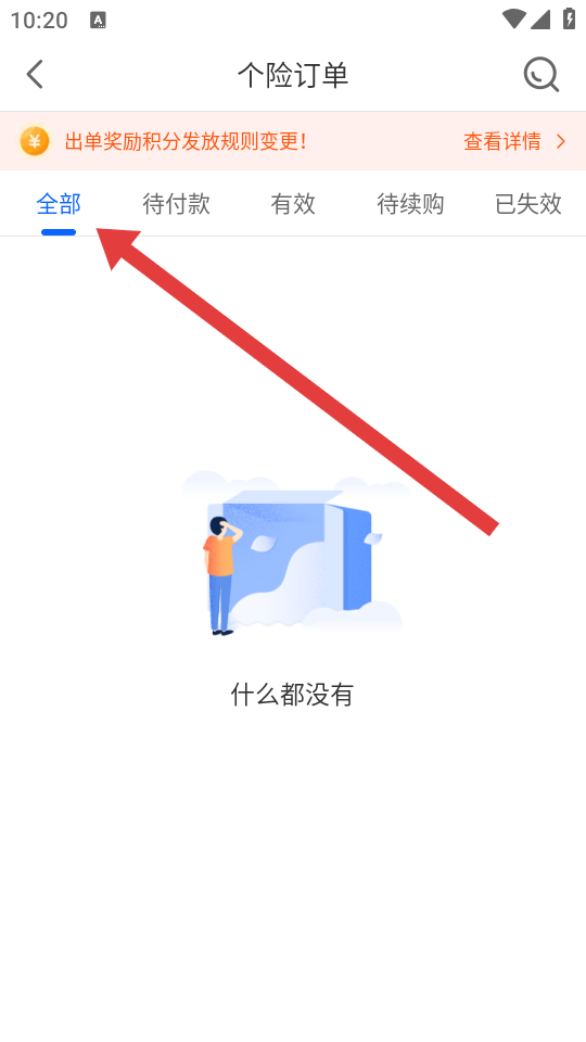 3、进入个险订单页面,点击全部的标签,可以查看所有个险订单状态含待付款、有效等分类。