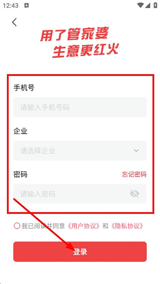 3、在账号密码登录页面,输入手机号、选择企业、输入密码,点击登录,完成账号登录。