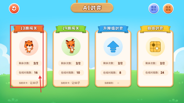 2、在AI对弈页面,点击13路闯关选项,进入13路闯关棋局。