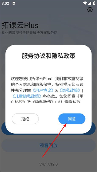 1、打开拓课云Plus app,在弹出的提示框中点击同意。