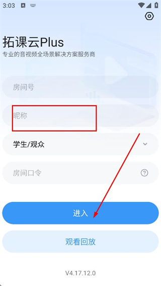 2.教室号和教室密码将由授课老师在班级群内统一通知,身份选择学生,昵称填写学生姓名;
