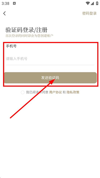 3、在验证码登录页面,输入手机号后,点击发送验证码。