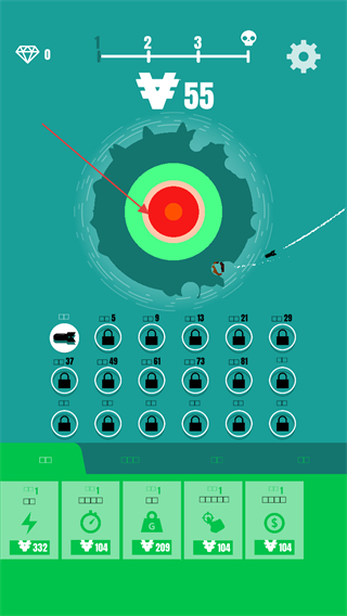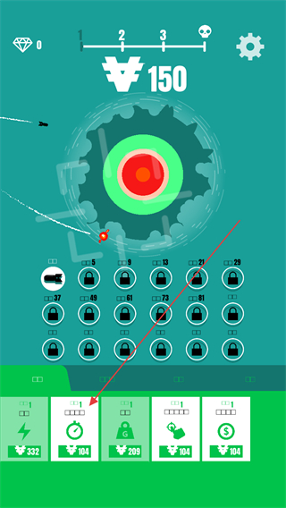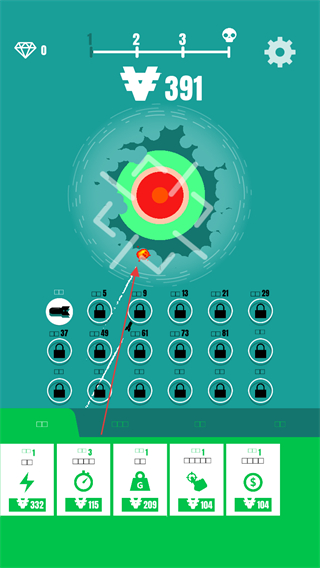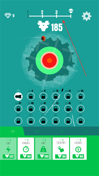 1、瞄准屏幕中央的靶心区域发射炸弹,尽量命中红色核心区域,以获取更高分数。