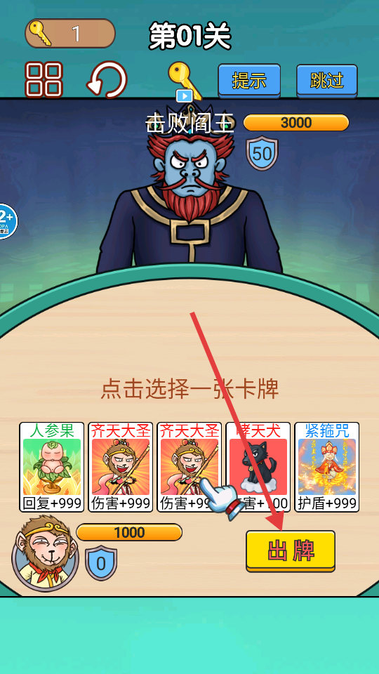 2、遇到妖怪别慌,点击卡牌召唤八戒沙僧群殴他们。