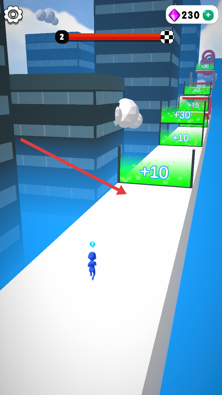 1、点击启动,操控蓝色小人沿跑道前进,收集绿色增益如+10、+15等,带领浅蓝色队伍推进。