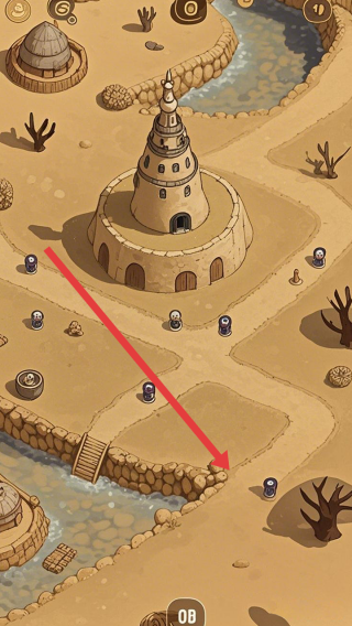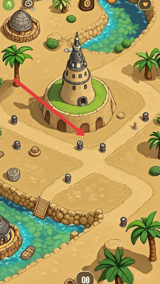 1、观察沙漠地图中塔楼周边敌人路径,规划防御建筑布局,利用地形阻挡敌人进攻,守护核心塔楼。