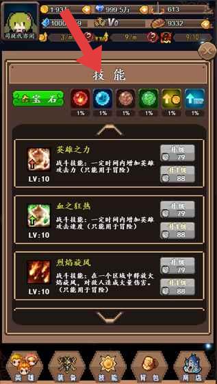 3、进入技能界面,优先升级【英雄之力】【血之狂热】【烈焰旋风】等战斗技能,借助技能特效提升冒险输出与生存力。