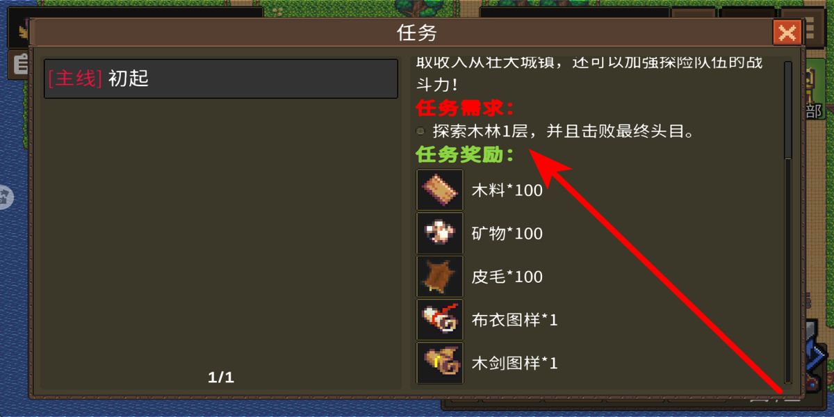 1、新手进入游戏主界面,点击下方任务按钮,查看当前任务的详情,了解任务的需求,如探索木林1层并击败最终头目,明确目标与奖励。