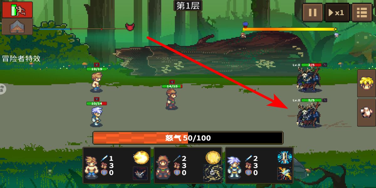 2、依据任务指引,点击冒险按钮,前往对应场景木林1层,进入冒险地图后,控制冒险者队伍移动,遭遇怪物时自动战斗,推进探索进程。