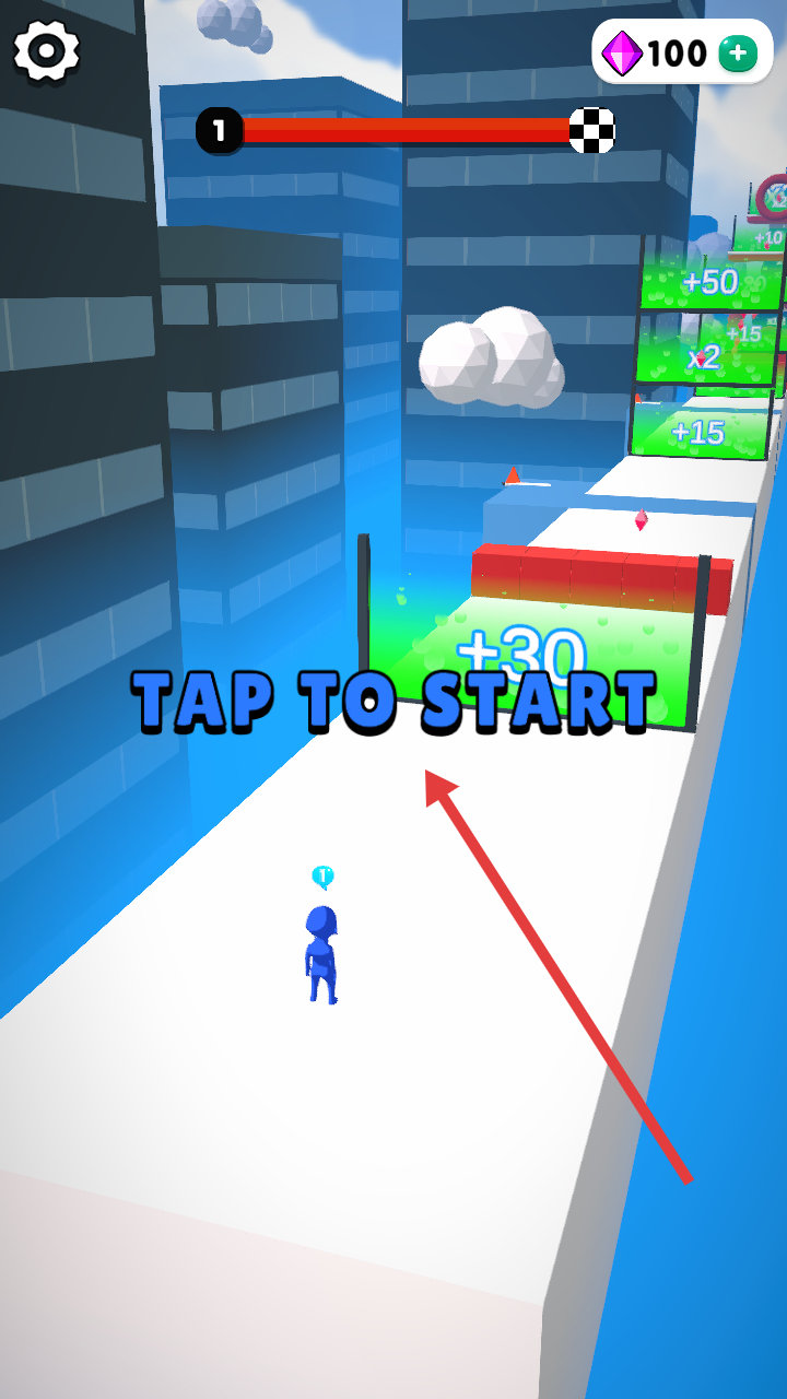 1、点击TAP TO START启动,操控蓝色小人沿城市跑道前进,收集绿色增益,像+30这类都可收集。