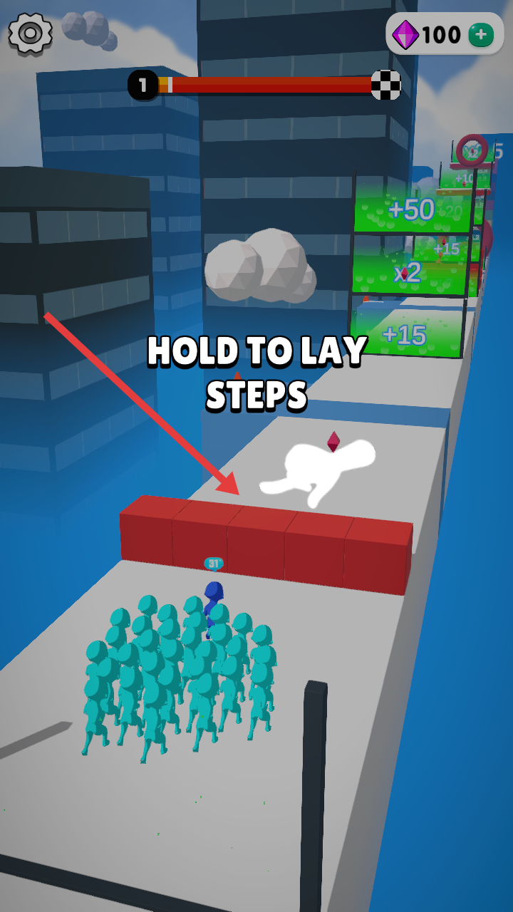 2、遇到红墙障碍,长按屏幕HOLD TO LAY STEPS,生成台阶跨越,带着队伍继续往前推进。